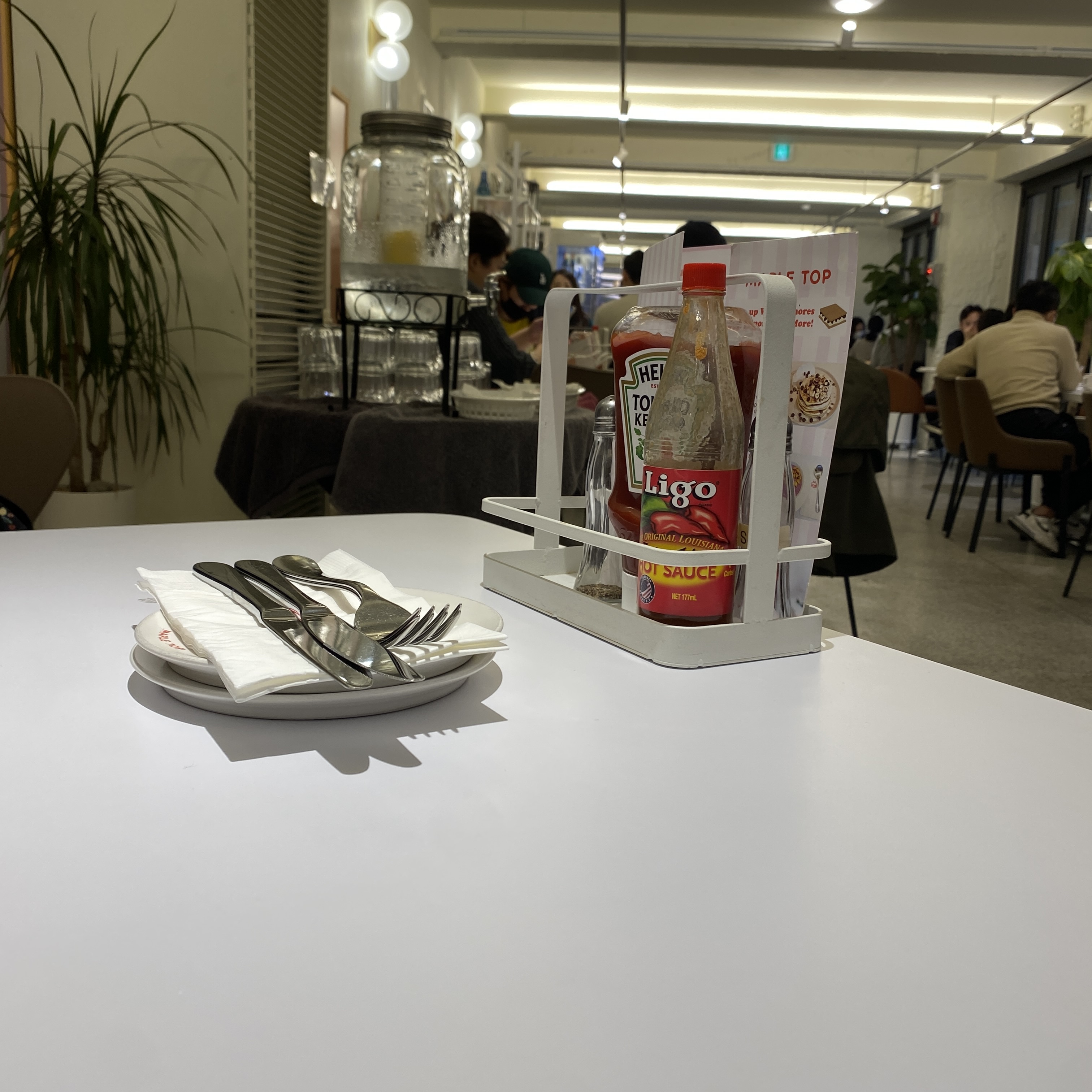 자리에는 메뉴판과 케찹, 후추 등 몇가지 소스가 세팅되어 있어요.