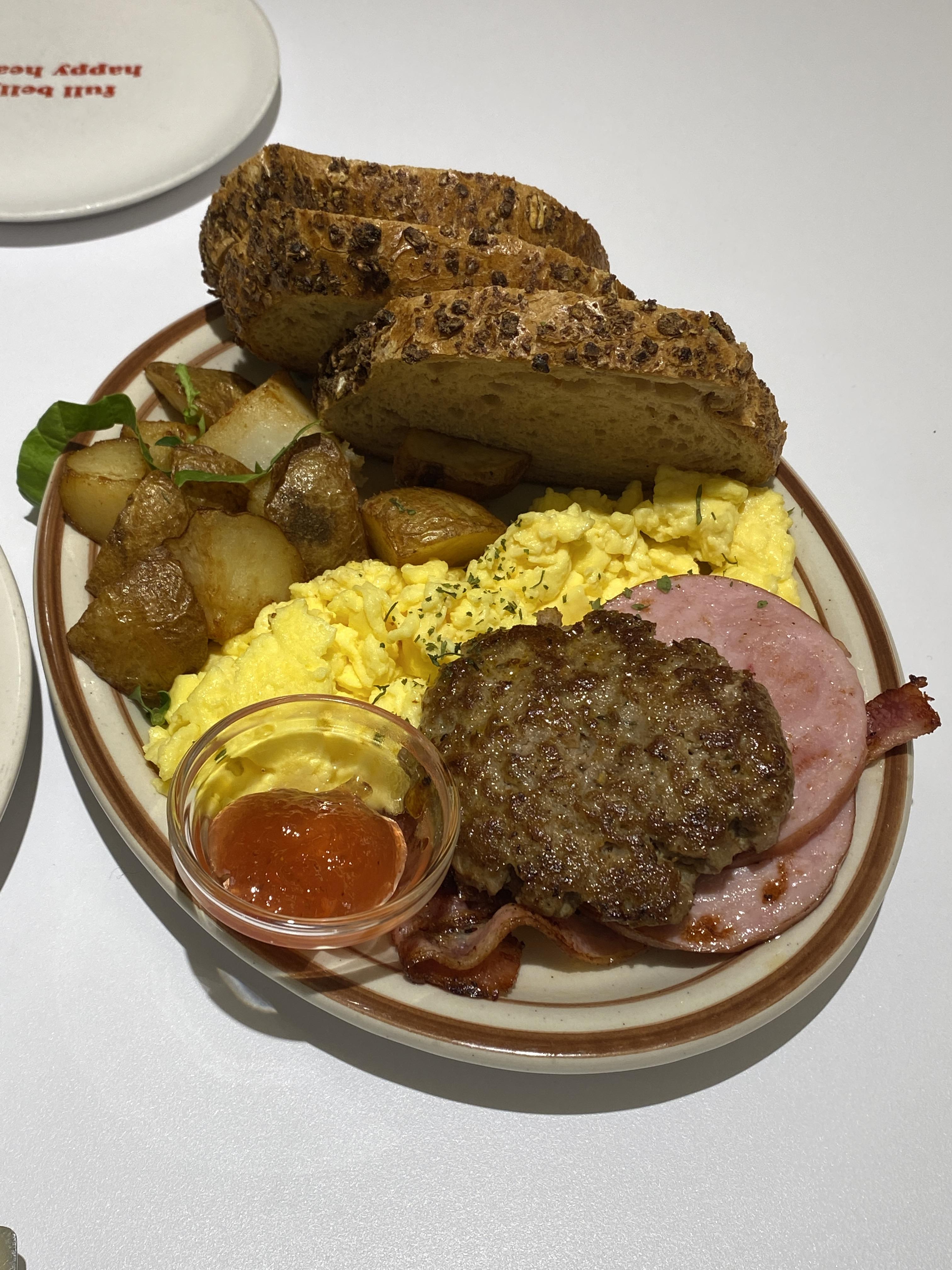 계란(2), 베이컨, 소시지, 햄, 컨트리감자, 토스트, 스크램블