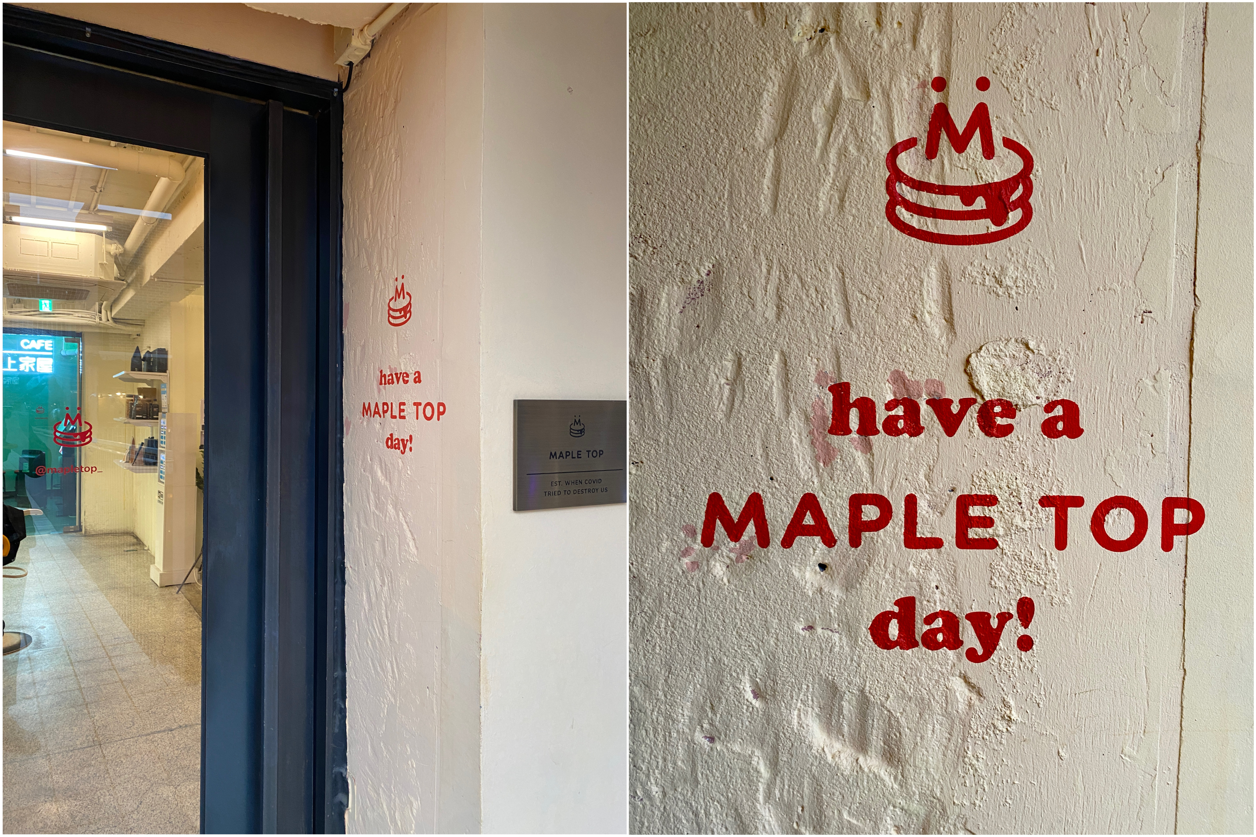 야외테이블을 지나 앞으로 쭉 들어가다 보면 귀여운 팬케이크 로고와 메이플탑 카페의 입구가 보여요 :)